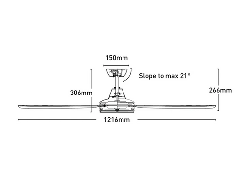 The brushless DC motor architecture is designed to reduce electrical losses and improve energy efficiency when compared with conventional AC motors, enabling smooth speed modulation with reduced operational noise. The compact ceiling-mounted profile, with an installed height of 306mm, allows installation in rooms with standard ceiling clearances while maintaining unobtrusive visual proportions. The 1216mm (48 inch) blade span provides broad air distribution coverage across the occupied area.