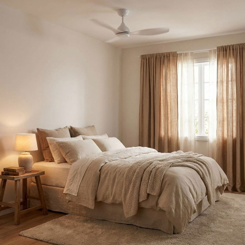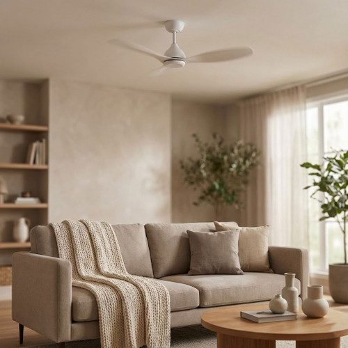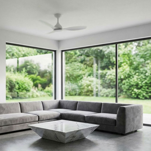 This ceiling fan combines architectural efficiency with a refined slimline form to deliver stable airflow performance for modern interior environments. Finished in white, it incorporates three aerodynamically contoured ABS blades engineered to minimise turbulence while sustaining smooth rotational stability. The steel body and canopy enhance structural durability, allowing the fan to integrate seamlessly into both residential living spaces and covered outdoor areas where reliability and controlled airflow are essential.