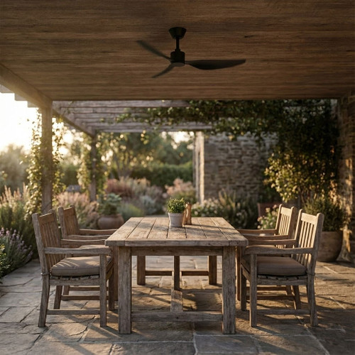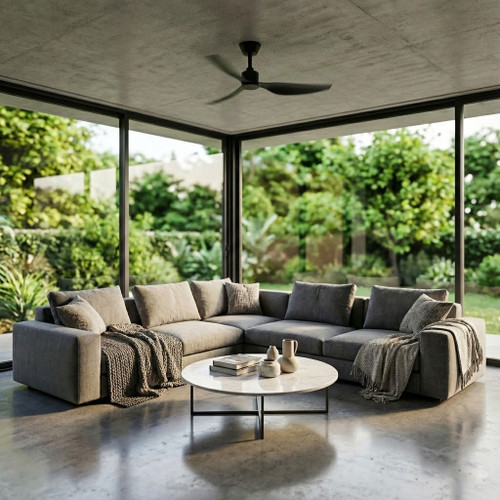 Designed for indoor and covered outdoor environments, this low-profile fan is suitable for installations requiring efficient cooling without compromising ceiling height or visual aesthetics. It must be installed by a licensed electrician to comply with GMA-516648-EA approval requirements and to ensure warranty validity. Supplied with an A23 12V remote battery and backed by a 6-year warranty (3-year in-home service plus 3-year motor coverage), this fan provides a reliable, long-term airflow solution with modern smart-control capability and a durable matt black finish.