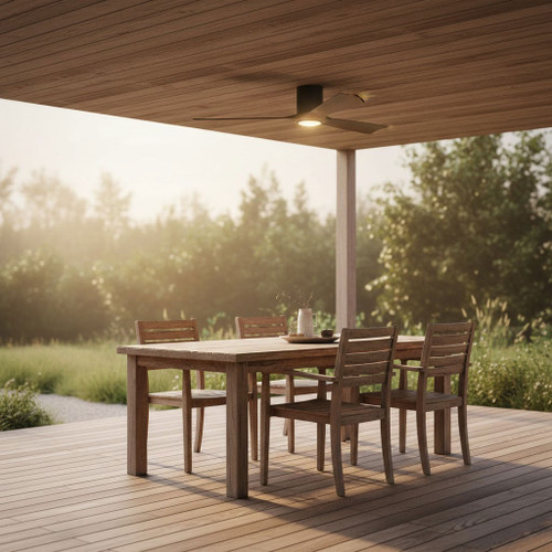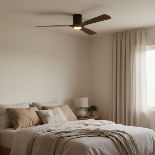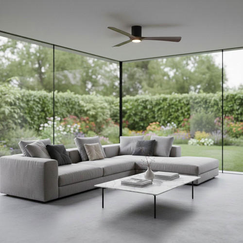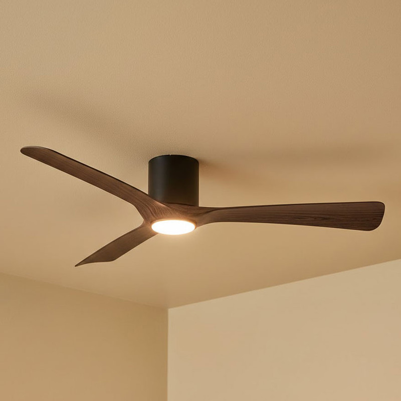 This ceiling fan integrates precision aerodynamic engineering with an elegant contemporary profile, delivering stable airflow performance and refined visual balance. Finished in matt black with walnut blades, it is constructed from high-quality ABS blade material paired with a rigid steel body and canopy to ensure long-term structural durability. The low-profile 230mm height enables unobtrusive installation in areas with reduced ceiling clearance, while the flat-surface hangsure configuration maintains a secure, vibration-free mounting interface. Its flush-mount form and PMMA lens cover create a cohesive architectural appearance suited to both residential and sheltered outdoor environments.