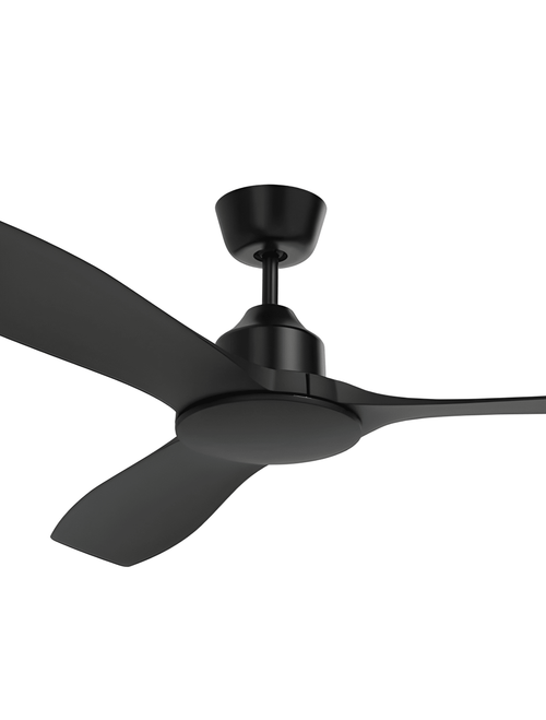 The structural assembly features a durable black finish combined with ABS non-rusting blades engineered for corrosion and UV resistance, supporting long-term dimensional stability and surface durability in indoor and enclosed outdoor applications. The compact motor housing and mounting assembly are designed for secure installation on both flat and raked ceilings, with the 13° hang-sure canopy providing reliable support on sloped surfaces. The integrated ceiling canopy profile and balanced construction contribute to controlled dynamic behaviour during operation, while the total installed mass of 5.06 kg assists in minimising vibration at higher rotational speeds.