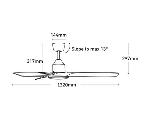 Air movement performance is maintained across the full operational range through the electronically commutated DC motor architecture, which provides stable torque characteristics, low acoustic output and improved electrical efficiency compared with conventional AC motor systems. The reduced overall installed height of 317mm supports installation in spaces with limited ceiling clearance, enabling effective air circulation without excessive protrusion into the occupied zone. The three-blade configuration promotes uniform airflow distribution while maintaining low rotational inertia for smooth acceleration and deceleration during speed changes.