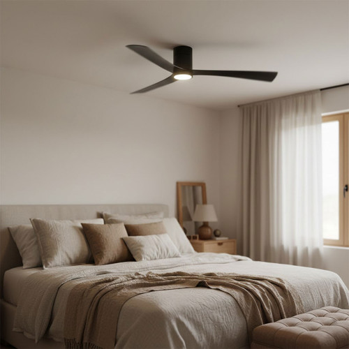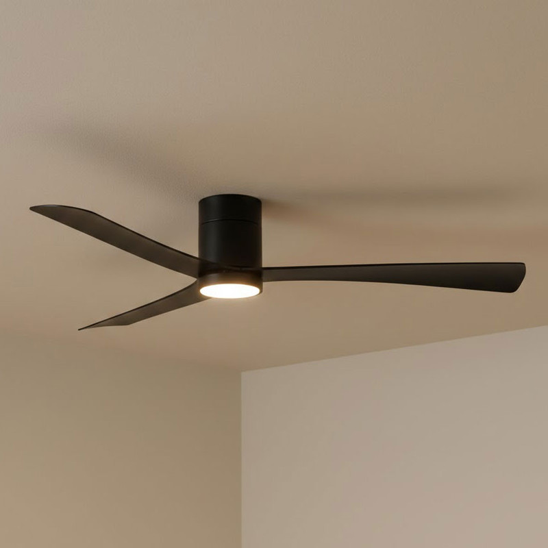 This ceiling fan is a low-profile smart DC ceiling fan engineered for high-efficiency air circulation and integrated lighting performance in modern indoor and covered outdoor environments. Finished in matt black throughout, the fan combines architectural minimalism with advanced motor technology to deliver smooth, stable, and energy-efficient operation. The precision-balanced three-blade configuration and slimline canopy design allow the unit to sit close to the ceiling at an installed height of only 220 mm, making it ideal for spaces with limited ceiling clearance while maintaining powerful airflow performance.