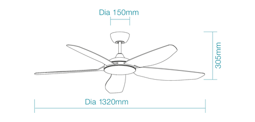 Constructed with five aerodynamically profiled ABS blades and a rigid steel body and canopy, the fan is engineered for long-term structural stability and resistance to mechanical deformation. The 14° blade pitch is optimised to enhance volumetric air displacement efficiency, achieving airflow performance of up to 14,110m³/hr at maximum speed with an airflow efficiency of up to 430m³/hr per watt. The slimline configuration, 305mm overall height and 150mm diameter ceiling canopy ensure a low-profile installation suited to standard and low ceiling applications.