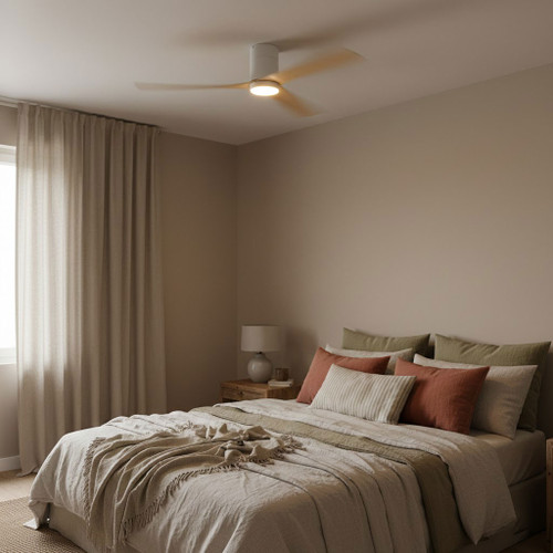 This ceiling fan is a low-profile smart DC ceiling fan engineered for high-efficiency air circulation and integrated lighting performance in modern indoor and covered outdoor environments. Finished in matt white with natural oak blades, the fan combines architectural minimalism with advanced motor technology to deliver smooth, stable, and energy-efficient operation. The precision-balanced three-blade configuration and slimline canopy design allow the unit to sit close to the ceiling at an installed height of only 220 mm, making it ideal for spaces with limited ceiling clearance while maintaining powerful airflow performance.