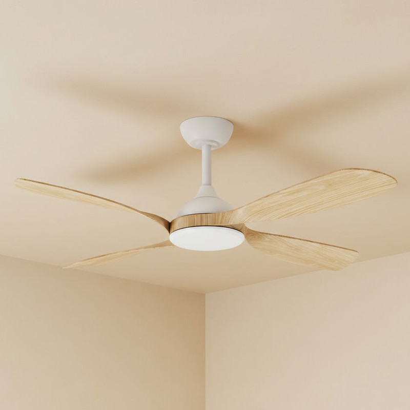 The construction integrates premium materials selected for durability and long-term operational integrity. The matt white (body and canopy) finish provides a clean architectural aesthetic, while the four oak (blade) ABS aerofoil blades are engineered for rigidity, low turbulence and accurate factory balancing. A 165mm ceiling canopy anchors the fan securely, complemented by a 10° hangsure system and an overall installed height of 295mm, ensuring compatibility with most standard ceiling applications and maintaining optimal clearance for efficient air movement.