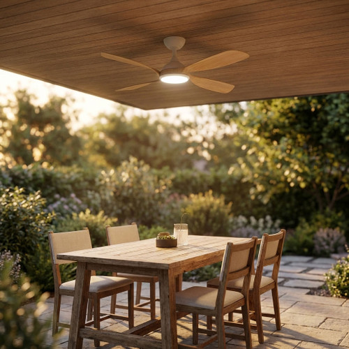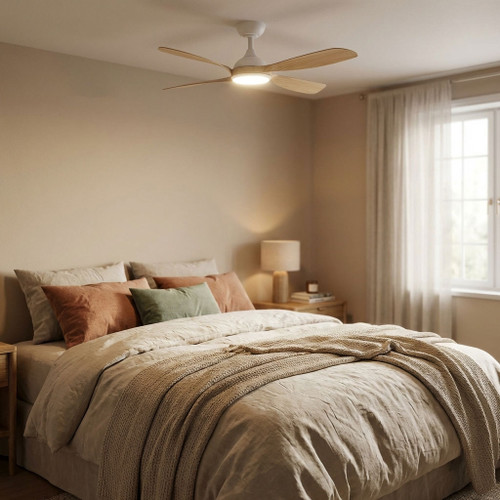 The structural composition integrates durable materials designed for long-term operational reliability. The matt white body and canopy provide a clean architectural profile, while the oak ABS blades are engineered to minimise turbulence and deliver balanced aerodynamic performance. The PMMA lens cover protects the integrated LED module and contributes to uniform light diffusion. A 165mm ceiling canopy and a 10° hangsure design ensure stable mounting, and the overall installed height of 320mm maintains efficient air distribution without imposing excessive overhead clearance requirements.