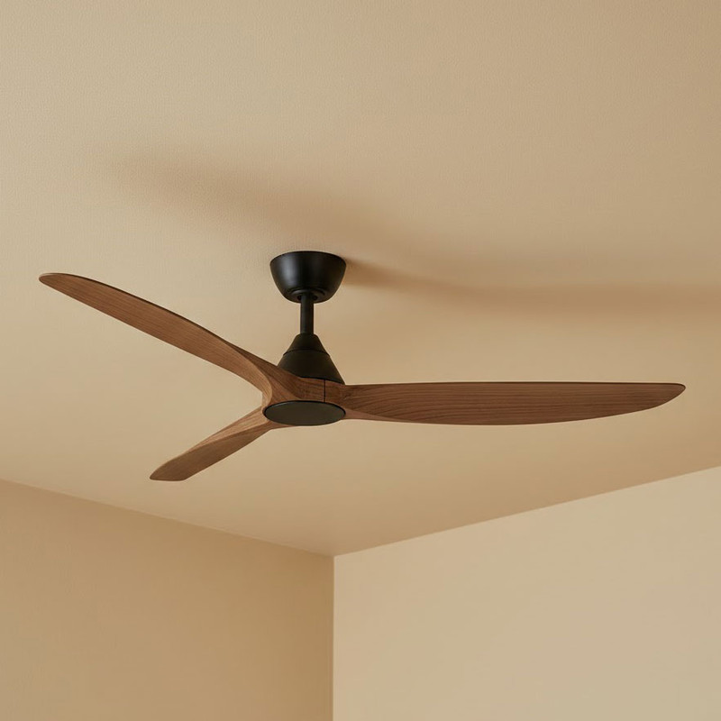 The aerodynamic system is configured with three precision-balanced ABS blades set at a 16° blade pitch to maximise volumetric air displacement and airflow efficiency of up to 400m³/hr per watt. The structural assembly utilises a steel body and canopy for dimensional stability and long-term mechanical integrity. The exterior finish integrates a matt black body and canopy with contrasting teak blades, delivering both visual refinement and durable surface performance.