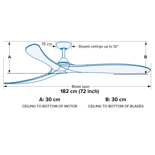 DIMENSIONS: 1830mm (blade span), 300mm (height from ceiling to blades)