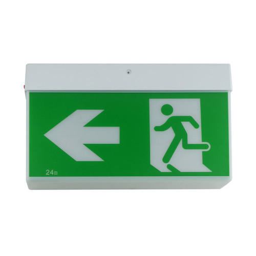 In terms of electrical performance, the unit functions as a 3W maintained emergency luminaire on a 240V supply (220–240V, 50–60Hz), keeping the exit legend illuminated during normal mains operation and automatically switching to emergency mode when power is lost. The LED chip is permanently integrated into the fitting, removing lamp replacement as a variable and helping maintain stable photometric output over its service life. With a correlated colour temperature of 6000K (daylight), the luminaire provides high contrast between symbol and background, improving the speed and accuracy of exit recognition in dim or smoke-affected environments. The combined optical and electrical design delivers a rated viewing distance of 24m, consistent with common design criteria for corridors and open-plan escape routes.