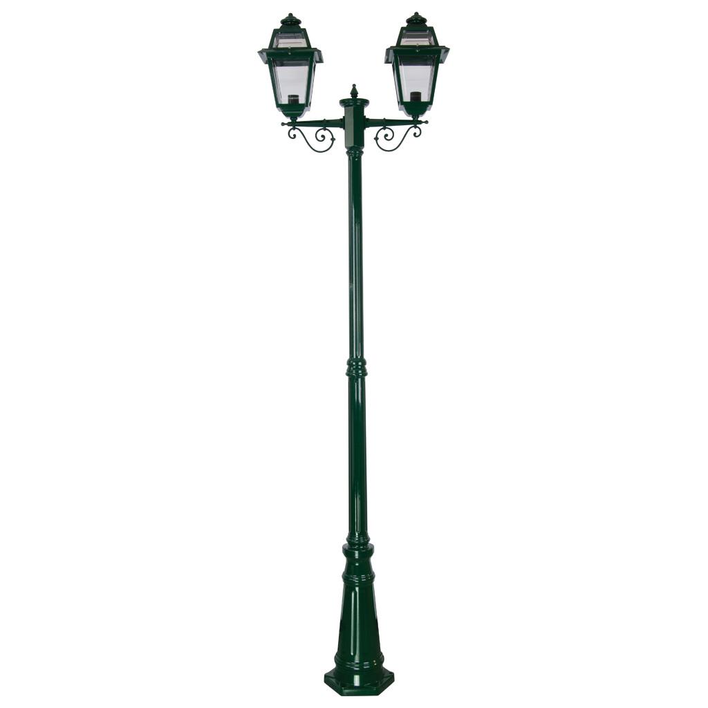 Avignon Green 2 light die-cast aluminium and moulded acrylic lens twin head 2.4m post light. Made in Italy, assembled and powder coated in Australia. Also available in Black, Burgundy, Beige & White. Requires 2 x B22 globe.