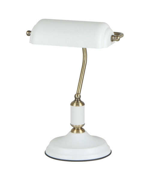 This banker lamp offers a refined balance of classical styling and modern functionality, making it an ideal choice for desks, side tables, and workstations. Finished in matte white with antique brass highlights, the design presents a striking visual contrast while maintaining a professional aesthetic. The cylindrical shade and precision-crafted metal body reflect a meticulous attention to detail, ensuring that the lamp delivers both decorative appeal and dependable performance in a variety of interior settings.