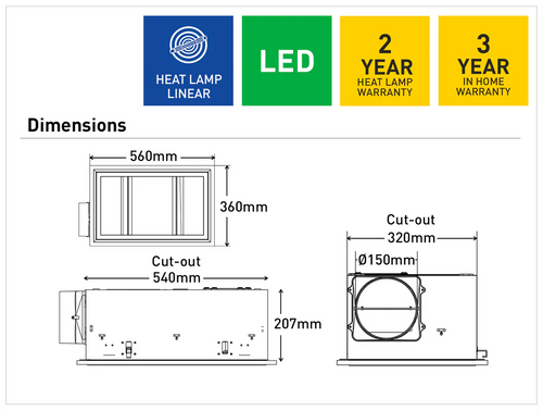 This bathroom heater fan is a high-performance 3-in-1 ventilation solution designed for residential bathroom environments, combining efficient air extraction, radiant heating and integrated LED illumination within a single recessed unit. Finished in black, the fitting features a durable metal housing and a low-profile fascia measuring 560mm x 360mm, allowing it to integrate cleanly into modern ceiling designs while maintaining a discreet visual presence.