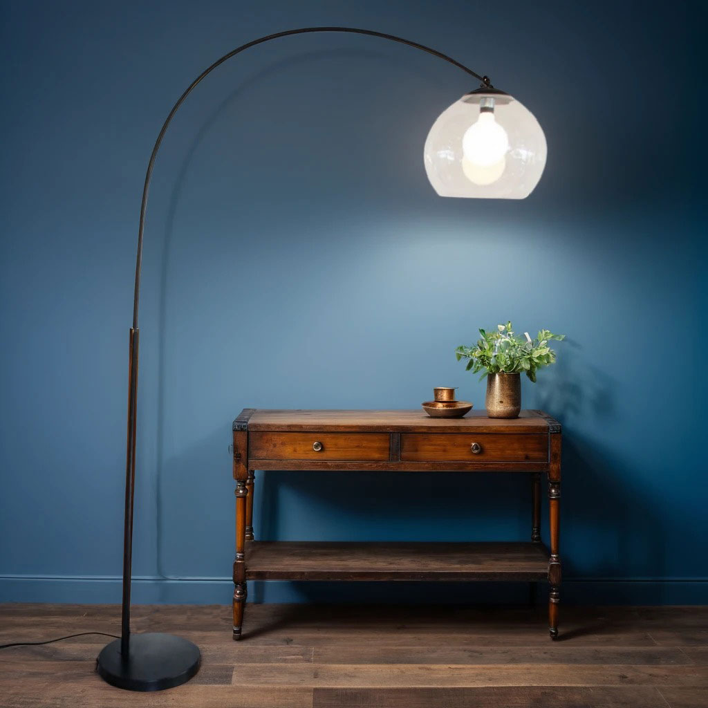 This floor lamp is a significant retro piece in your contemporary spaces. The switch is conveniently placed on the cord for easy on/off foot operation. The shade is clear acrylic with a large 250mm opening at the front, allowing for easy access to replace a large globe. The arc is fixed in place, but the shade can be adjusted. Its weighted base 320mm diameter is designed to counter the 1200mm projection of the arc lamp.