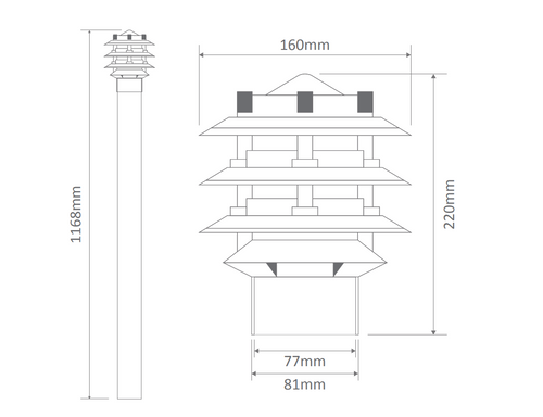 Standing at a total height of 1168mm, this bollard light is supported by a robust 76mm diameter post, included as part of the unit. The head measures 220mm in height and 160mm in diameter, with layered louvres that shield the light source from direct view while contributing to its iconic profile. The design integrates form and function, supporting uniform light distribution while enhancing architectural symmetry in both commercial and residential installations.