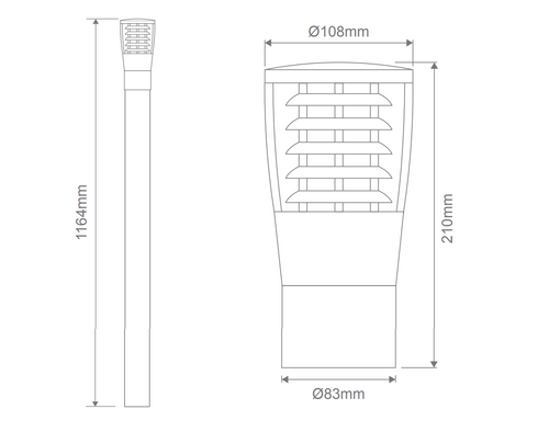 With an overall height of 1164mm, the bollard structure includes a 1-metre post with a 76mm diameter and a head section measuring 210mm in height and 108mm in diameter. This proportioned assembly facilitates effective light distribution along pathways, entryways, and landscaped zones while maintaining a coherent visual balance. The integrated optical housing is engineered to accommodate the E27 globe discreetly within the louvred enclosure, optimising downward light diffusion and minimising glare without compromising illumination intensity.