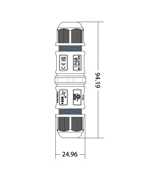 This cable connector is a robust and high-performance 2-way cable extension solution engineered for secure electrical connections in demanding environments. Designed with a durable black housing, it utilises a combination of nylon and polycarbonate materials, complemented by a brass conductor to ensure excellent electrical conductivity and long-term mechanical integrity. The compact form factor, measuring 94.19mm in length and 24.96mm in diameter, allows for efficient integration into tight installation spaces while maintaining structural strength.
