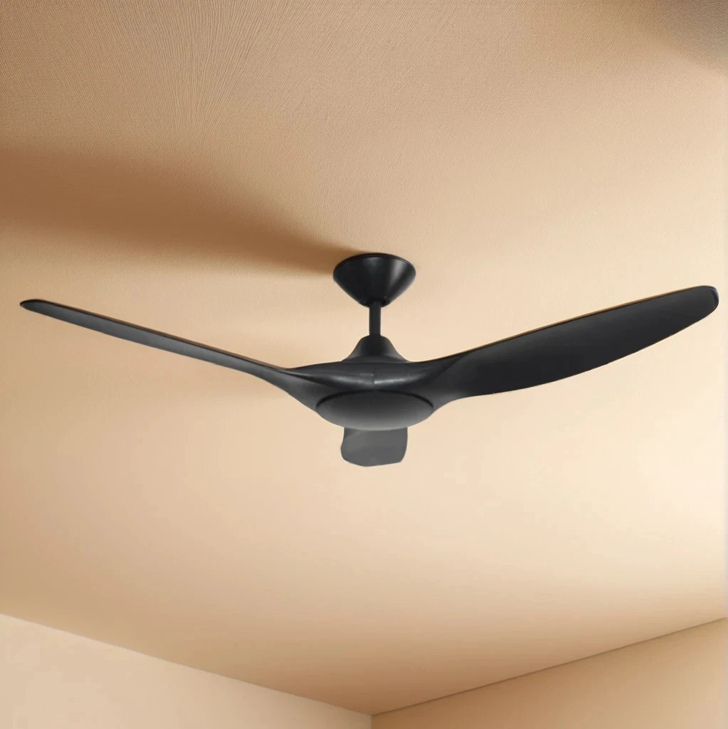 This ceiling fan exemplifies a streamlined and minimalist design paired with superior airflow performance, making it a sophisticated solution for both indoor and outdoor undercover spaces. This model features three elegantly contoured blades constructed from durable ABS polymer, including the motor housing and canopy, all finished in a sleek black. With a blade span of 1320mm and a blade pitch of 13°, it delivers efficient air circulation within a compact vertical clearance of 290mm. The integrated canopy measures 170mm by 60mm, and the fan can be installed on raked ceilings up to 38° when using an optional mounting kit.