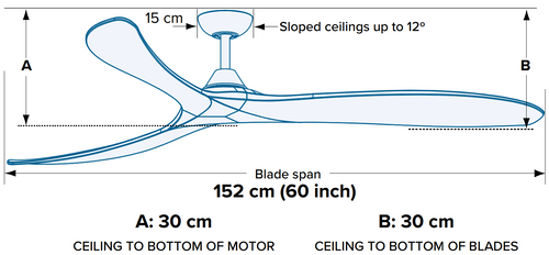 The supplied six-speed remote control enables intuitive operation, offering reverse-cycle mode for seasonal versatility, a fan-off timer function (1, 3, 6 or 8 hours), and natural breeze simulation. The fan is engineered to accommodate ceiling slopes up to 12°, and has a fixed drop of 300mm from ceiling to blade base. This makes it compatible with standard ceiling heights of 2400mm or more, although installation on higher ceilings may benefit from an optional extension rod to improve air distribution in expansive spaces.