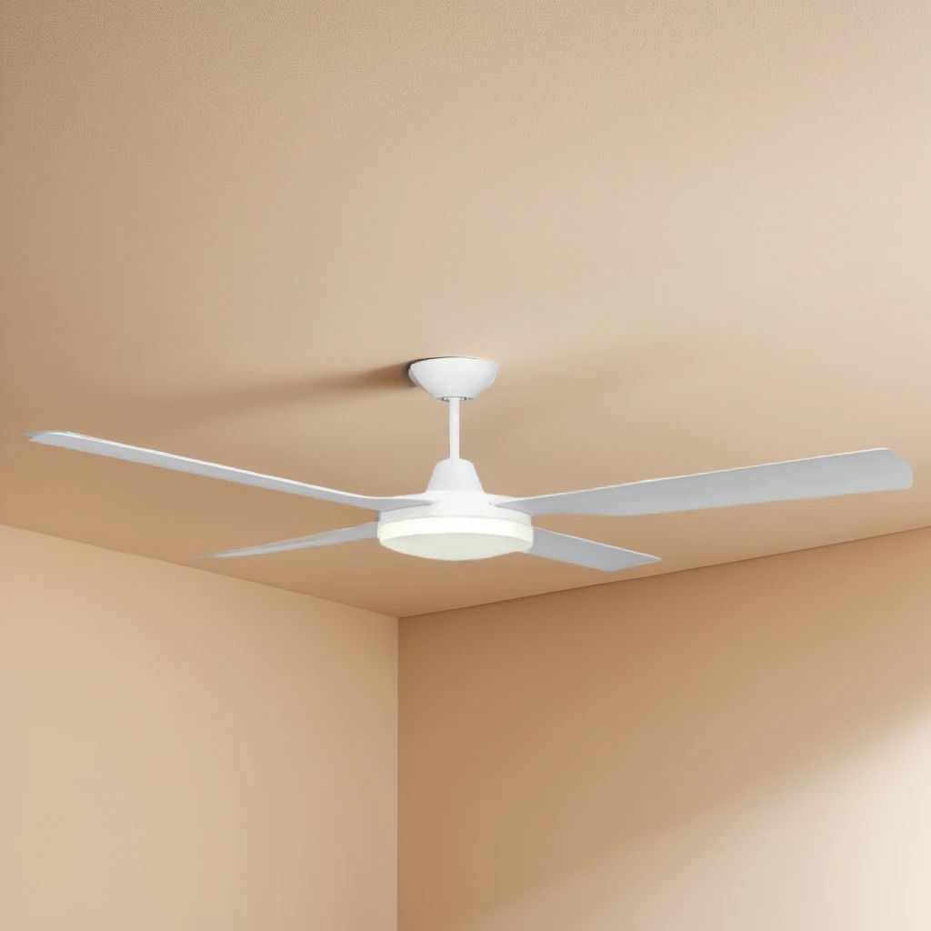 This ceiling fan in white is an advanced, energy-efficient air movement and lighting solution designed for residential use. Featuring four precision-moulded ABS blades, the fan is constructed from non-rusting, anti-corrosive materials, ensuring suitability for indoor and covered outdoor installations. With a blade span of 1220mm and an optimised blade pitch of 8°, the design delivers uniform airflow with minimal operational noise. Its compact profile and neutral colour enable it to integrate seamlessly into a wide range of interior styles.