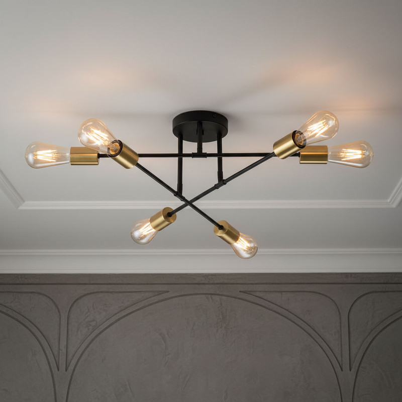 This ceiling light combines precision engineering with modern elegance, offering a highly functional and visually striking illumination solution for contemporary interiors. The black metal frame is paired with satin brass lamp holders, creating a refined contrast that enhances both modern and classic design schemes. With six evenly distributed lamp heads, the fitting ensures balanced light dispersion, making it an ideal choice for living rooms, dining rooms, or other communal spaces requiring both efficiency and style.