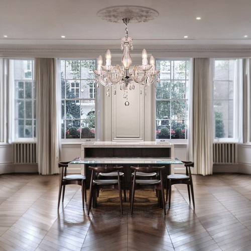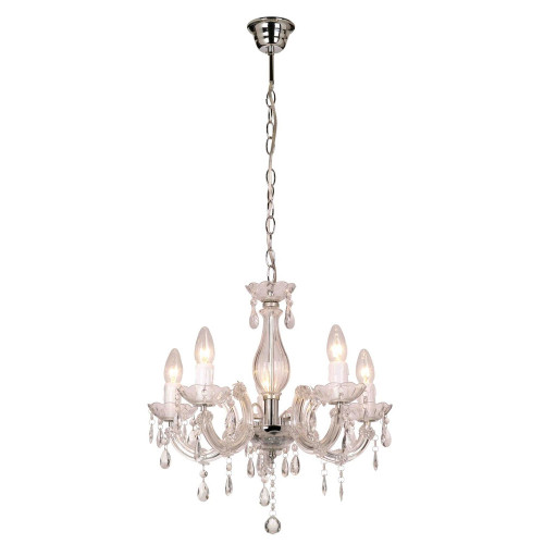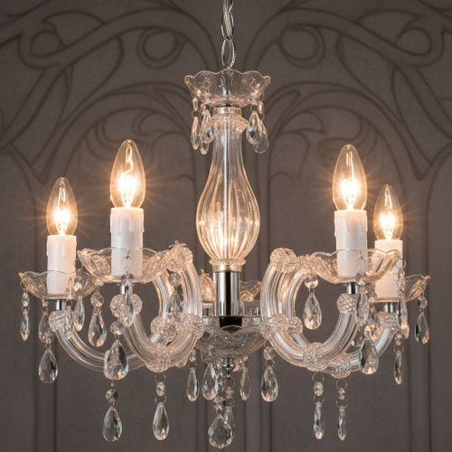 A five arm chandelier with its style and versatility, giving a cozy atmosphere to any room and a beautiful light that will revitalize your space.