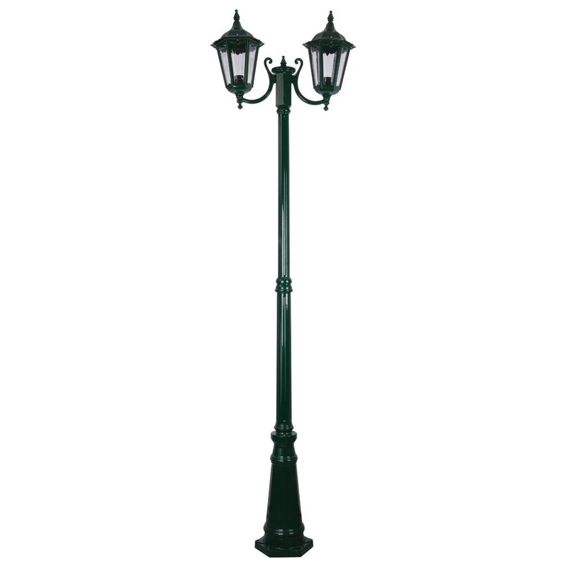 Chester Green 2 light die-cast aluminium and moulded acrylic lens twin head 2.4m curved arm post light. Made in Italy, assembled and powder coated in Australia. Also available in Black, Burgundy, Beige & White. Requires 2 x B22 globes.