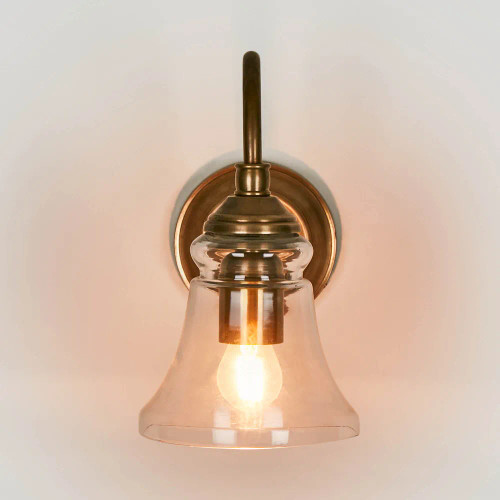Beautiful bell glass shade wall light in Antique Brass. Please note that most glass components are handmade and therefore small air bubbles, slight defects and colour variations may naturally occur during the glassblowing process.