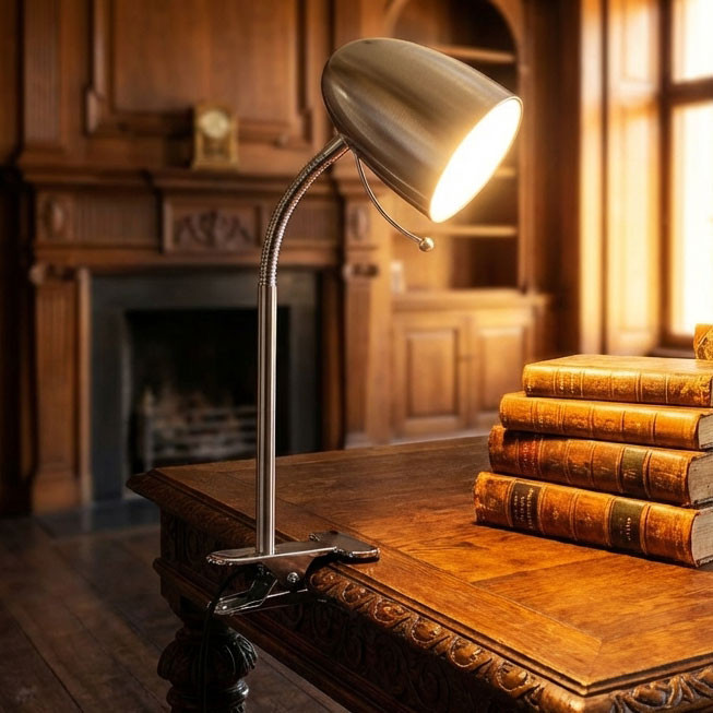 This clip table lamp is engineered to provide stable, task-focused illumination for desks, shelves, and bedside applications, combining a compact clamping mechanism with a flexible gooseneck for precise directional control. The luminaire features a durable metal construction and a secure mounting clamp that allows attachment to a wide range of horizontal surfaces, ensuring consistent positioning during operation. Finished in chrome, the fitting is designed to integrate cleanly into modern residential and workspace environments while maintaining a compact footprint suitable for confined areas.