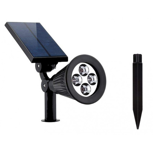 INCLUDES: 1 x solar spotlight with 4 powerful LEDs, 1 x solar panel, 1 x rechargeable battery, 1 x spike
