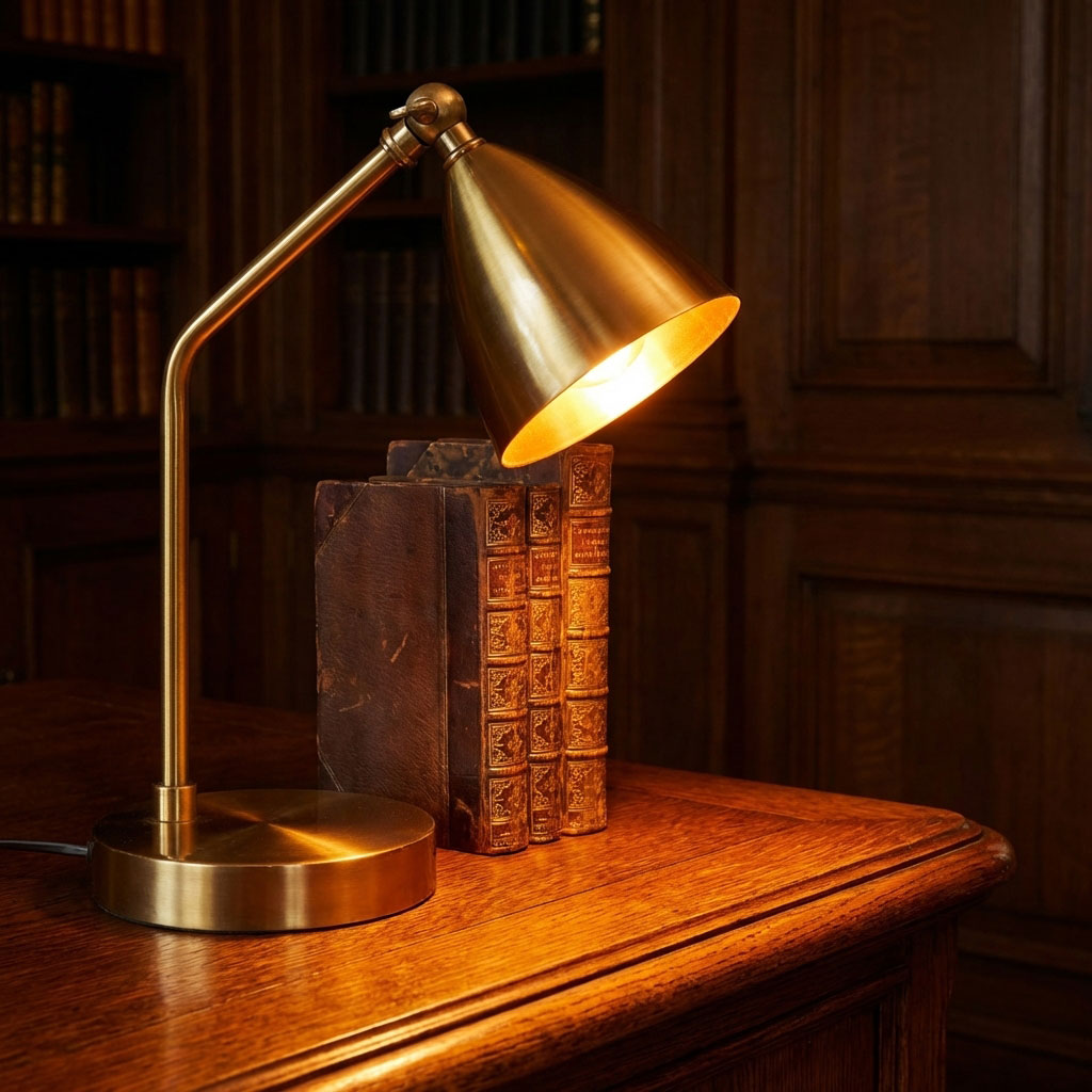 This desk lamp exemplifies refined functionality and elegant form, crafted to meet the demands of both practical illumination and visual sophistication. Constructed from high-quality brass and finished in antique brass, it showcases a timeless design inspired by mid-20th century industrial aesthetics. The lamp's composition not only contributes to its robust structural integrity but also adds a warm, muted metallic patina that enhances its decorative appeal in both contemporary and traditional interiors.