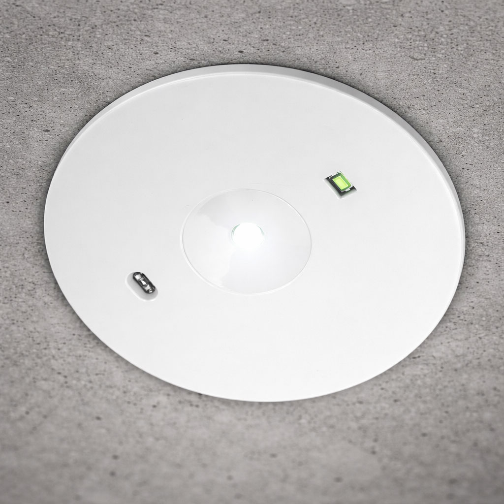 This industrial strength emergency downlight combines a lifetime-warranted LED with an optical lens to deliver an unobtrusive, ultra-bright source of illumination intended to alleviate panic and establish a safe, distinct and efficient path in the event of an emergency. It comes with a disc that can be recessed into a ceiling cavity. It can be used in almost all internal general applications including offices, shopping centres, commercial properties and residential buildings.