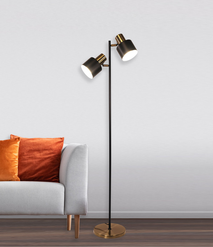 This floor lamp in antique brass and black is designed as a refined and versatile lighting solution, combining functionality with mid-century style. Its twin adjustable heads allow for precise directional illumination, making it ideal as a reading light beside a lounge or bed, or as an accent piece in a living room or office. The contrast between the antique brass finish and the matt black body gives the lamp a sophisticated aesthetic that suits both modern interiors and more traditional spaces.