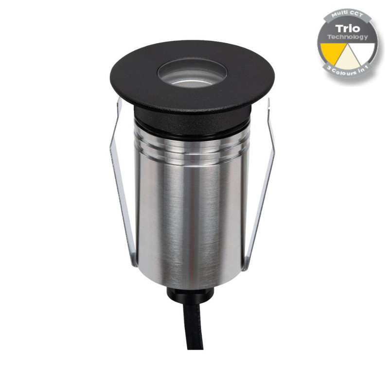 Optimised for flexibility, the fitting features Tri-CCT technology, allowing colour temperature selection between 3000K, 4000K and 5500K. Powered by a 2.5W CREE LED module, it produces up to 150lm and operates on 12/24V DC constant voltage systems. With a 36° optical beam, the luminaire provides controlled and effective accent lighting, while a CRI of ≥90 ensures accurate colour rendering across surrounding materials and architectural finishes. The robust design is rated IP67 for full water protection and IK10 for maximum impact resistance, making it suitable for harsh outdoor environments and public spaces.