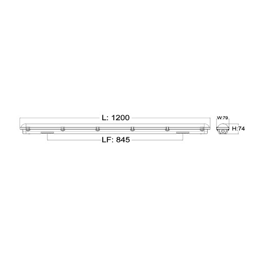 The fixture includes two stainless steel grade 304 mounting brackets and one IP65-rated connector, ensuring reliable installation and connection integrity. With a compact profile measuring 1200mm in length, 79mm in width, and 74mm in height, this LED batten is a compact yet powerful lighting solution, backed by a three-year warranty for assured performance.