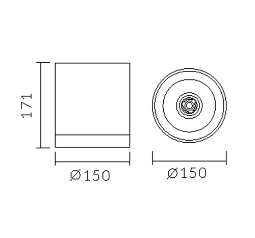 The luminaire is constructed with a durable powder coat finish and features concealed fixings, allowing for a clean, seamless appearance once installed. With overall dimensions of 150mm in diameter and 171mm in height, it is designed for surface mounted applications while also offering the flexibility to be suspended where required. The inclusion of an integral driver simplifies installation and ensures compatibility with standard electrical systems.