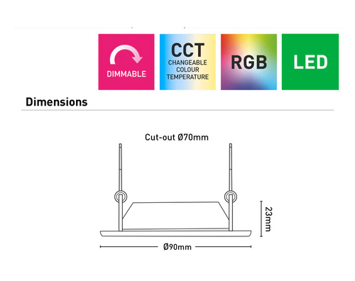 The compact form factor, measuring 90mm (diameter) x 23mm (height) with a 70mm cutout, supports installation in ceilings with limited cavity depth and ensures compatibility with common recessed apertures. An integrated independent driver provides regulated electrical performance and consistent light output, while the wide 110° beam angle promotes uniform illumination with reduced shadowing across the lit surface. The integrated LED light source with CRI >80 ensures accurate colour rendering for white light applications.