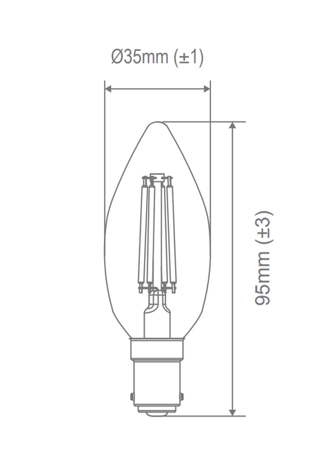 This LED filament globe is engineered to provide efficient, visually pleasing illumination in a compact and elegant form. Designed in a classic C35 candle shape, it features a frosted glass envelope that gently diffuses the light source, offering a softer visual profile while maintaining high efficiency. With a height of 95mm and a diameter of 35mm, the lamp is ideal for use in fixtures where space is limited yet reliable output is essential. The B15 base ensures compatibility with a wide range of decorative fittings, including chandeliers, wall sconces, and accent lamps.