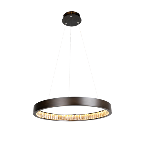 This pendant light is a precision-engineered decorative luminaire designed to deliver controlled, high-quality illumination while presenting a refined architectural presence within indoor environments. Finished in a bronze tone with clear crystal elements, the circular ring profile creates a balanced visual geometry that enhances spatial definition over dining tables, entry foyers and feature zones. The aluminium structure provides mechanical stability and corrosion resistance, while the integrated crystal components optimise light refraction for a clean, luminous output. The overall construction is optimised for long-term reliability in residential and hospitality interiors where visual impact and performance consistency are both critical.