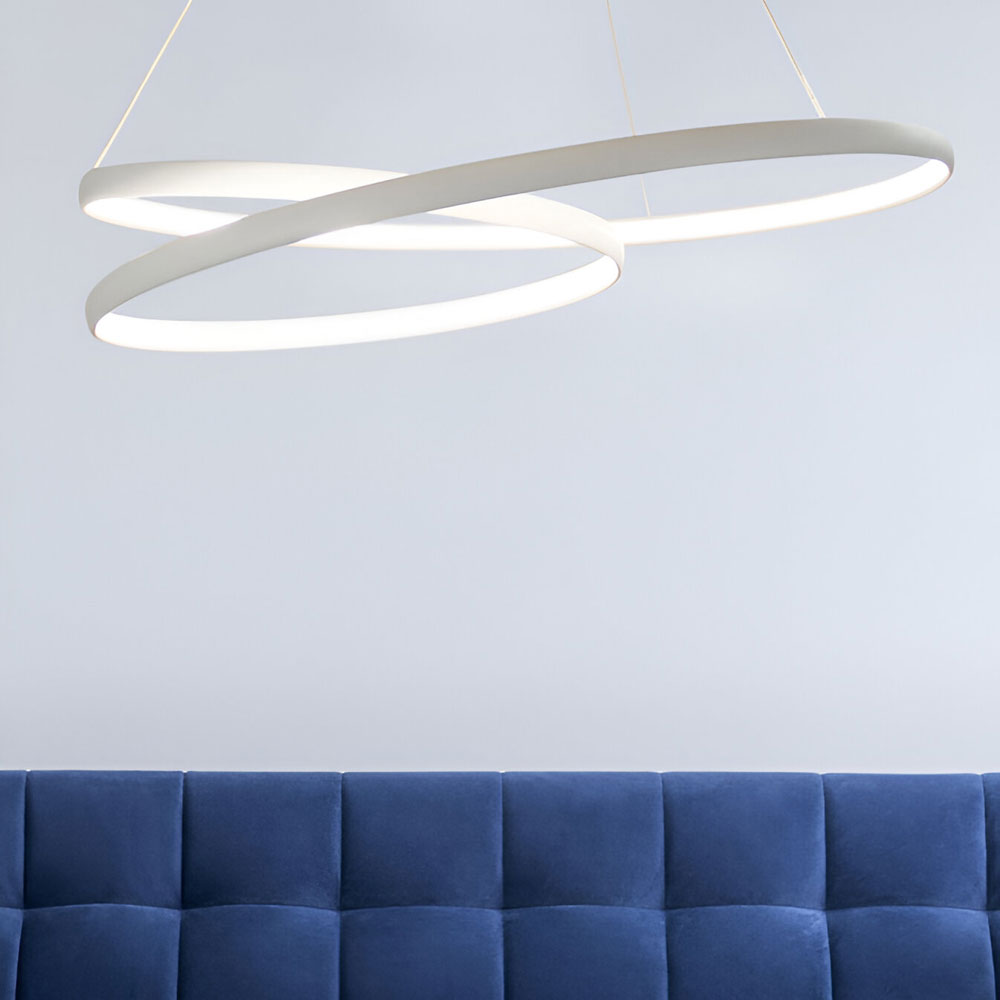 Operating at a maximum LED wattage of 50W, this pendant light delivers a luminous output of 3000 lumens, ensuring a high level of brightness with excellent energy efficiency. Its dimmable functionality ensures compatibility with standard dimmer systems, enabling fine control over light intensity to suit varying mood and activity requirements. The 1500mm adjustable suspension system enhances installation versatility across different ceiling heights, while also providing design freedom in positioning and visual impact. The pendant form, with its intersecting LED rings, creates a sculptural and contemporary profile, offering both practical lighting and artistic architectural value.