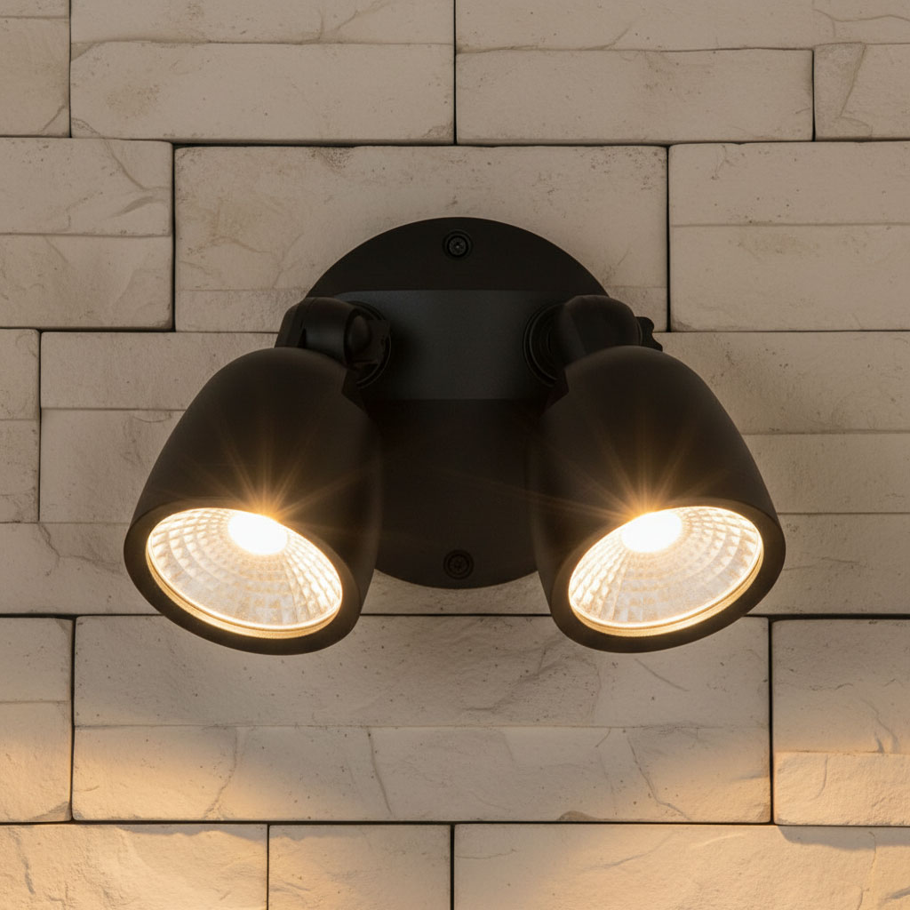 This LED spotlight in a black finish with twin adjustable heads offers a powerful and durable solution for outdoor illumination, combining robust construction with advanced optical performance. Manufactured from polycarbonate and rated at IP65, it is designed to withstand exposure to rain, dust, and other environmental stresses, ensuring reliable operation in fully weatherproof and marine conditions. Its compact design, with a 135mm projection and 124mm base width, enables seamless integration into residential or commercial exteriors while delivering a modern, functional appearance.