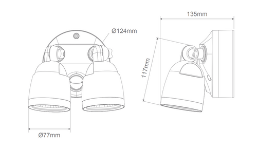 Colour accuracy is assured with a CRI of ≥90, maintaining natural visual quality across illuminated areas. The twin spotlight heads, each 77mm in diameter and 117mm in length, are proportioned for both visual balance and optical efficiency. This variant incorporates a slimline motion sensor with a 120° detection range of approximately 10 metres, offering automatic activation for enhanced security and convenience. The sensor settings are adjustable, allowing lux sensitivity from daylight to night and timing from 10 seconds to 12 minutes.