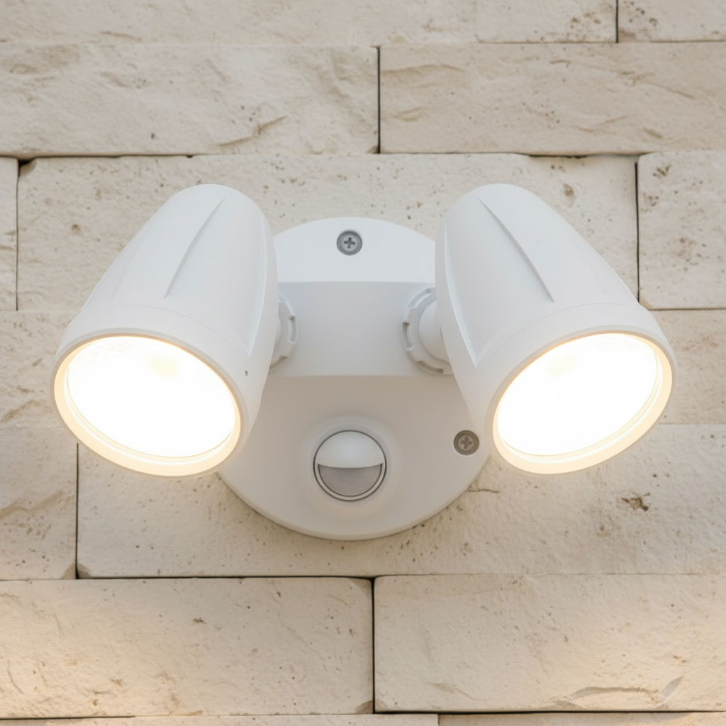 Accurate colour reproduction is maintained with a CRI of ≥90, ensuring natural visual clarity. The dual spotlight heads, each 76mm in diameter and 108mm in length, balance visual uniformity with functional performance. This variant is fitted with a slimline motion sensor with a 120° detection field and a range of approximately 10 metres, enabling automatic activation for enhanced safety and energy efficiency. Adjustable lux and timer controls allow operation to be tailored from daylight to night and between 10 seconds and 12 minutes.