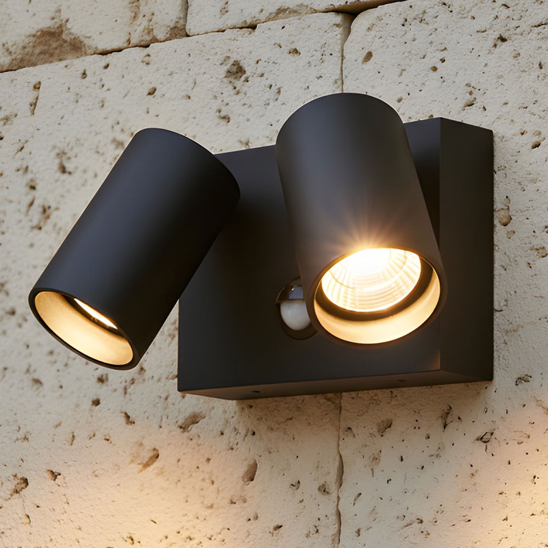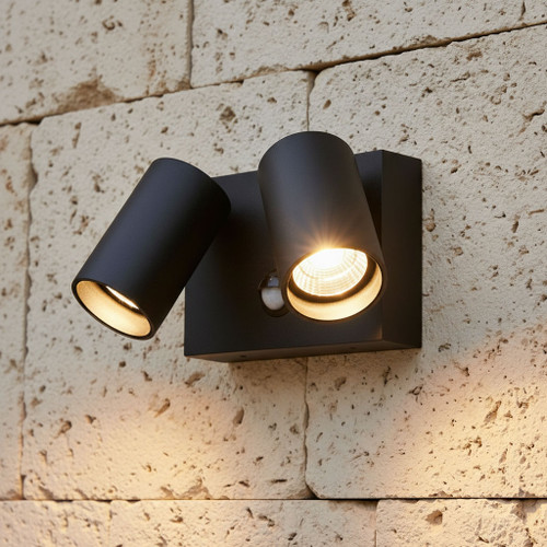 Designed for precision and flexibility, the adjustable spotlight heads can be rotated 360° horizontally and tilted 90° vertically, enabling accurate directional control of the light output. The fitting measures 111mm (height) x 157mm (width) x 96mm (projection) and is surface mounted for a clean, architectural finish on walls and solid structures. This model incorporates a built-in PIR motion sensor with a 120° detection angle and a range of up to 8m, providing automatic activation when movement is detected and enhancing safety and energy efficiency in outdoor environments.