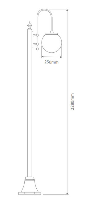 This is a black light post with a curved arm and a single down-facing head. Made from die-cast aluminium body complete with a 250mm opal acrylic sphere. Made in Italy, assembled and powder coated in Australia.
