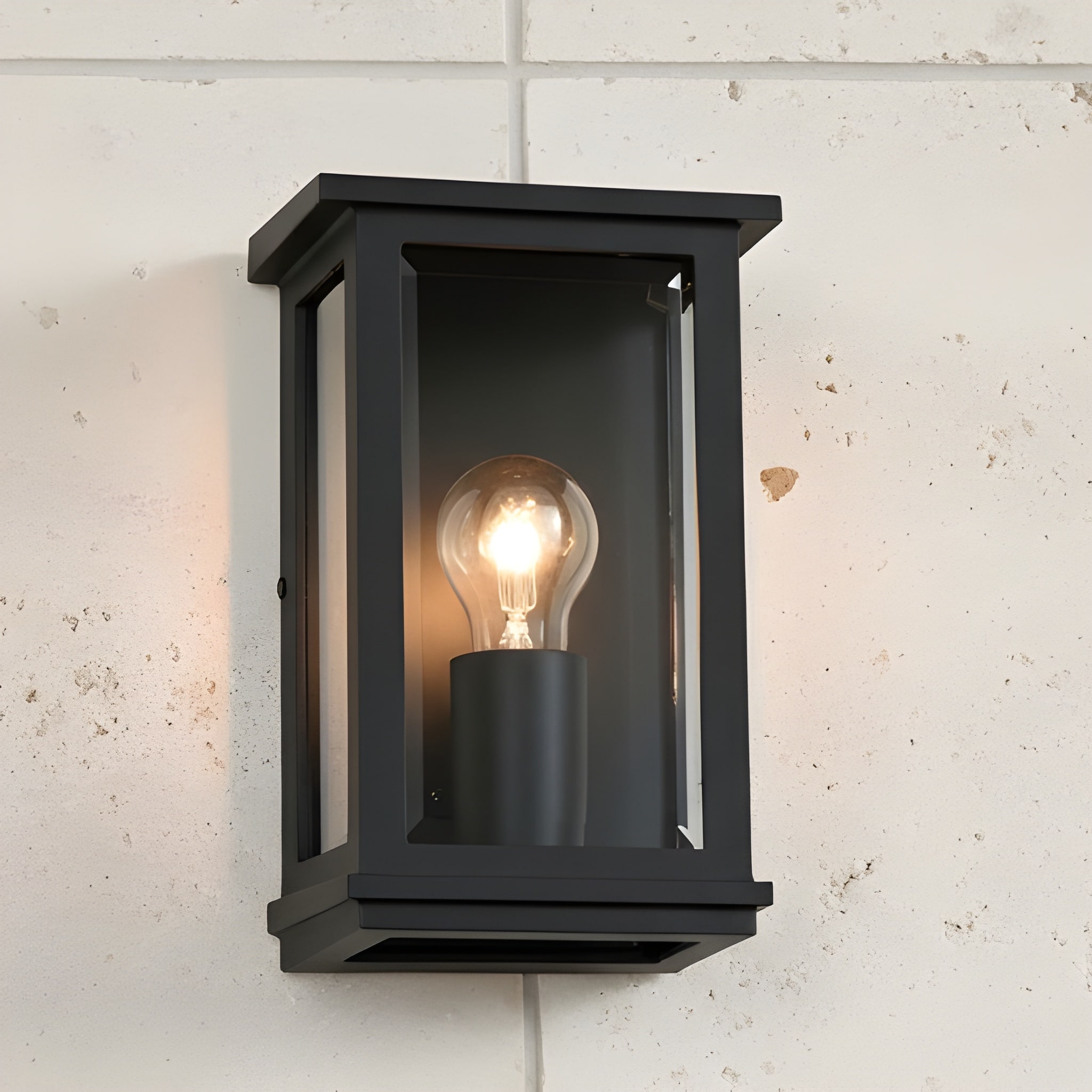 This marine grade wall light is engineered for reliable operation in demanding coastal environments. The luminaire presents a vertically mounted, surface-fixed architecture with a boxed clear bevelled glass panel housed within a robust black-finished body. With an ingress protection rating of IP44, the enclosure provides resistance against splashing water from any direction, making it suitable for sheltered exterior zones and high-humidity installations. The assembly supports a single E27 light globe and is specified for a maximum system load of 60 W.