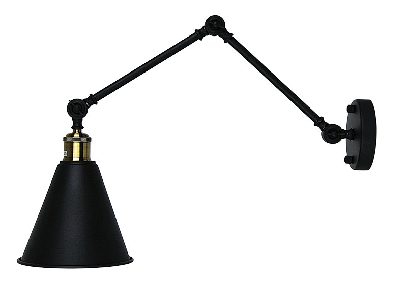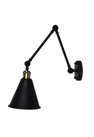 An ideal bedside or theatre room wall lamp, this can be positioned to provide light, without the glare. The shade has a dark inner, providing adequate task lighting. It has three elbow joints enabling adjustment of the arms to a suitable angle (measurements given are based on the position used in the image - can be shorter or longer, depending on your chosen position). Matt black finish with an antique brass feature, makes this light suitable for a Hamptons, Industrial or traditional home. It is designed for the wall, but could also be used as a ceiling mounted light.