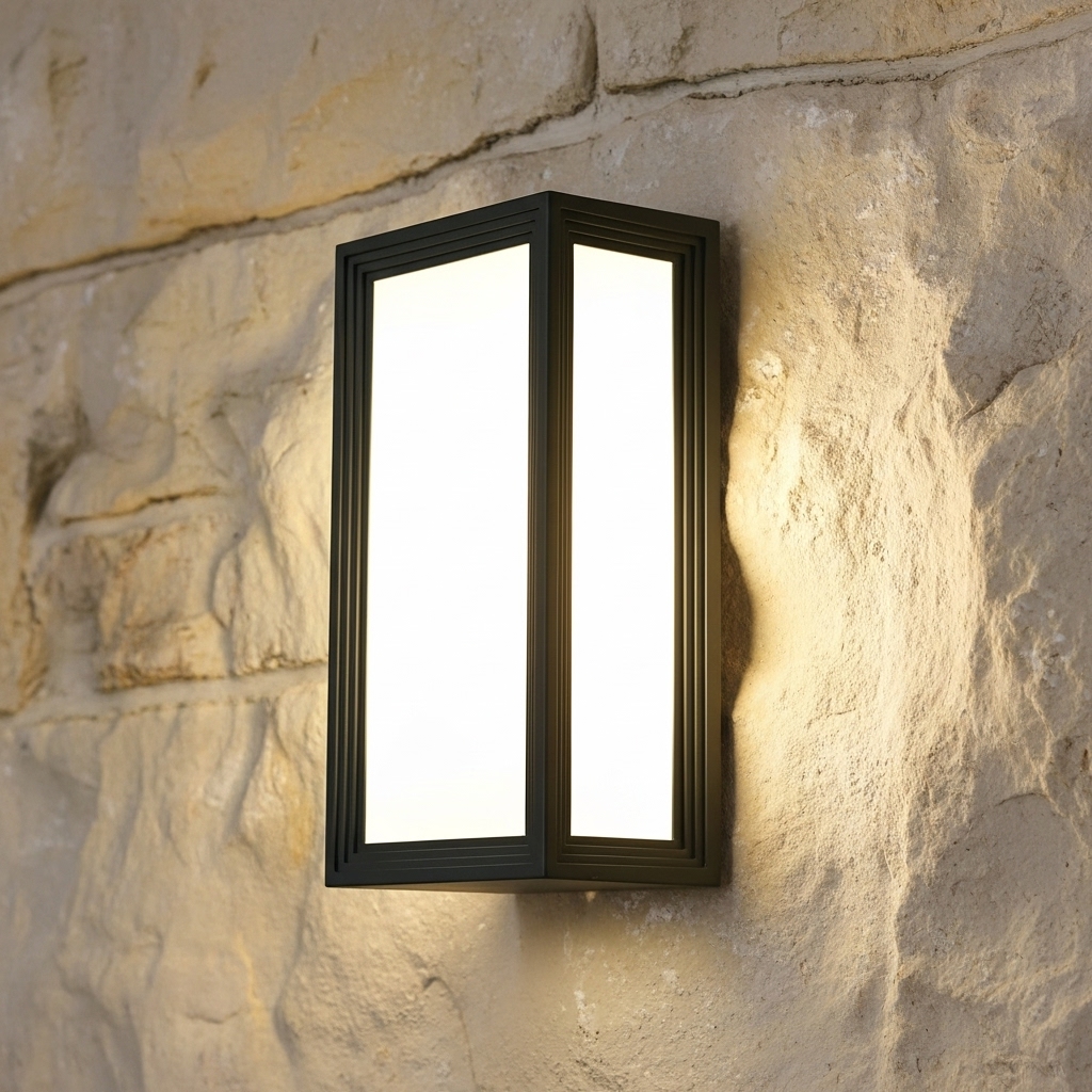 This is a beautiful wall light, perfect for both outdoor and indoor use. It is modern, with clean lines, and uses an opal acrylic side panel to diffuse the light against glare.