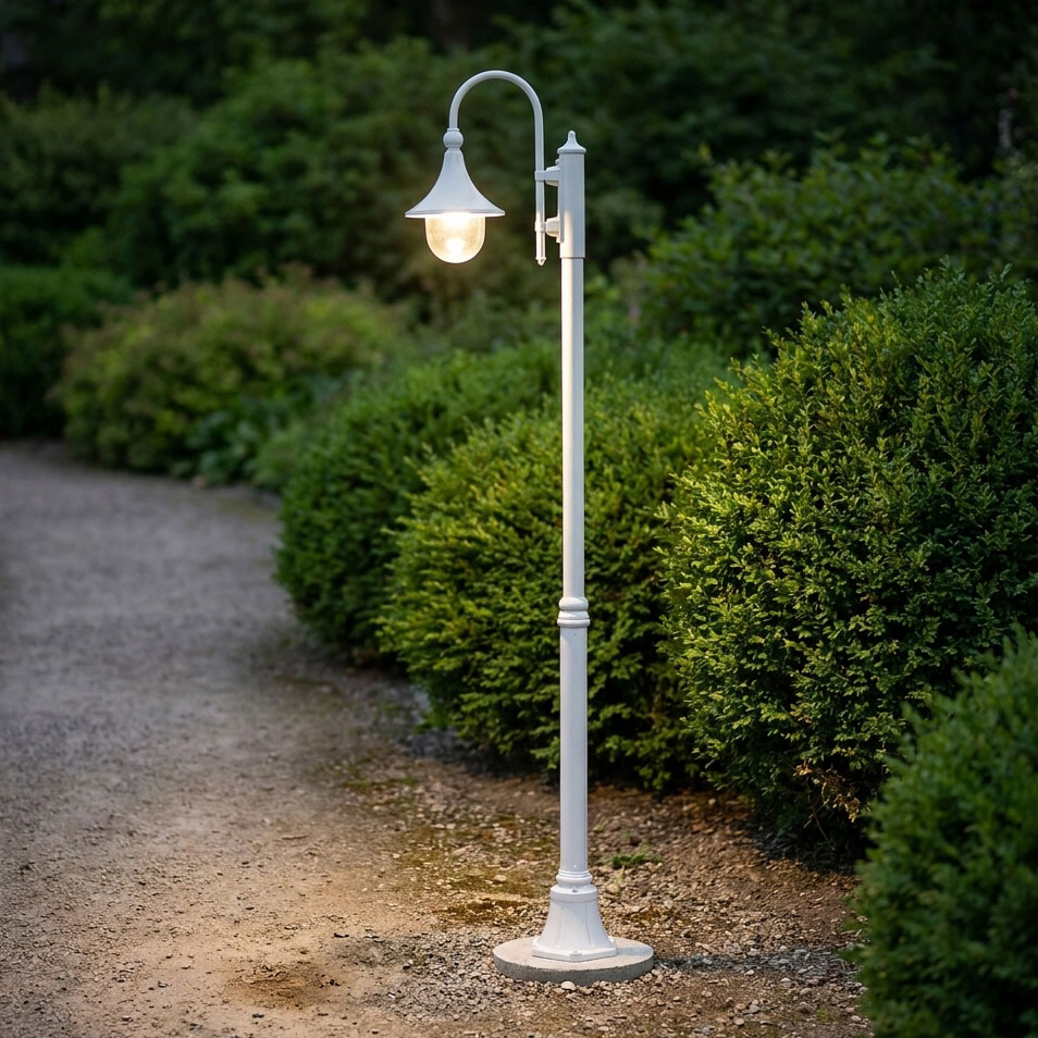 Monaco White 1 light die-cast aluminium and moulded acrylic lens single head 1.98m post light. Made in Italy, assembled and powder coated in Australia. Also available in Black, Burgundy, Green & Beige. Requires 1 x E27 lamp.
