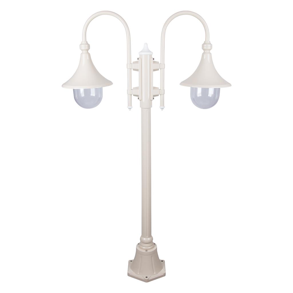 Monaco Beige 2 light die-cast aluminium and moulded acrylic lens twin head 1.35m post light. Made in Italy, assembled and powder coated in Australia. Also available in Black, Burgundy, Green & White. Requires 2 x E27 globes.